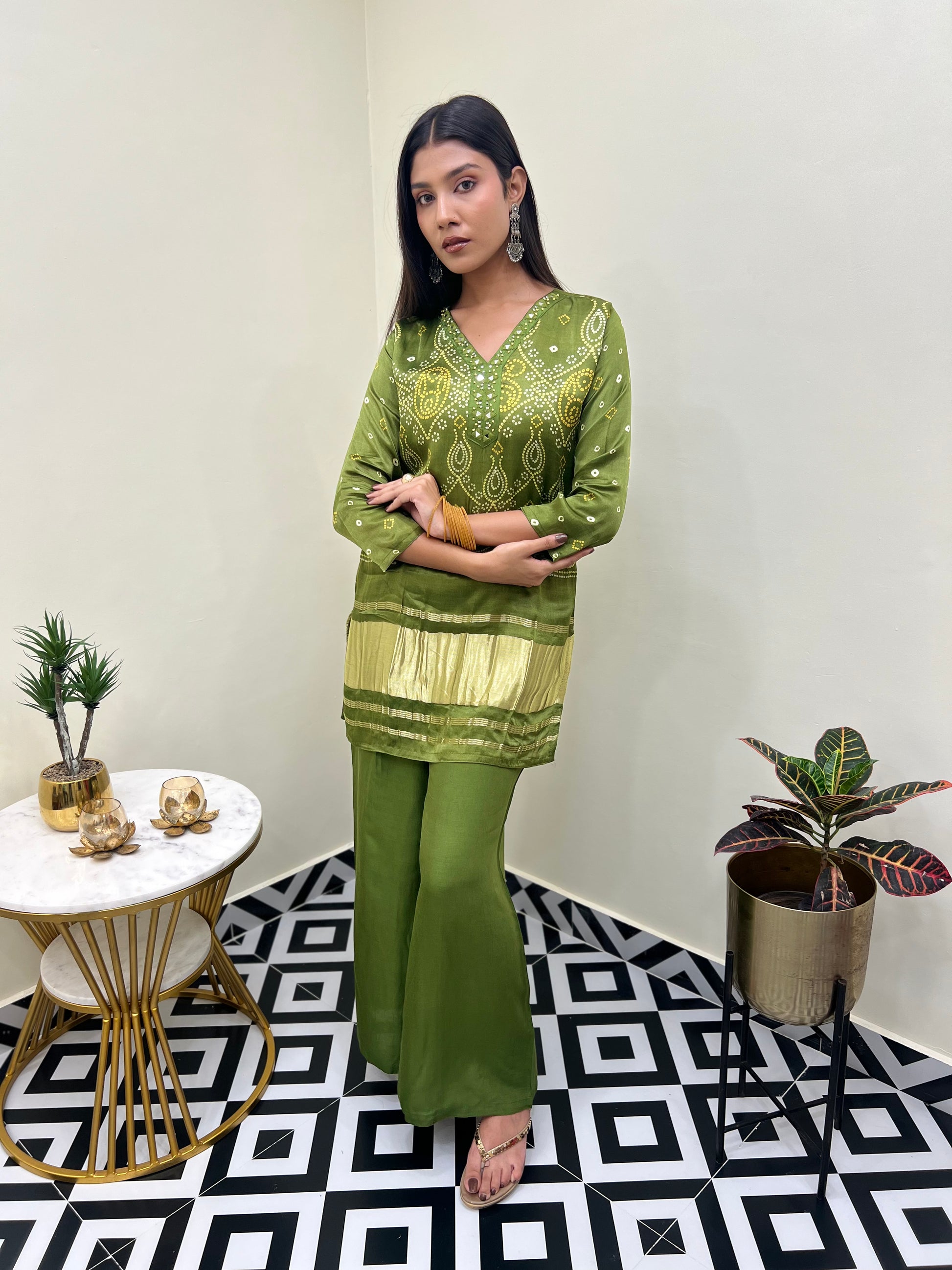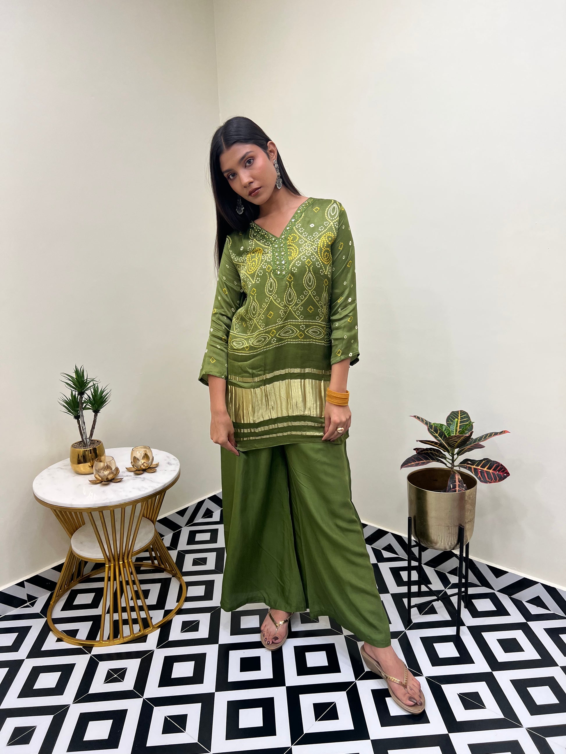 - Design: Bandhani print with V-neck kurta and palazzo set