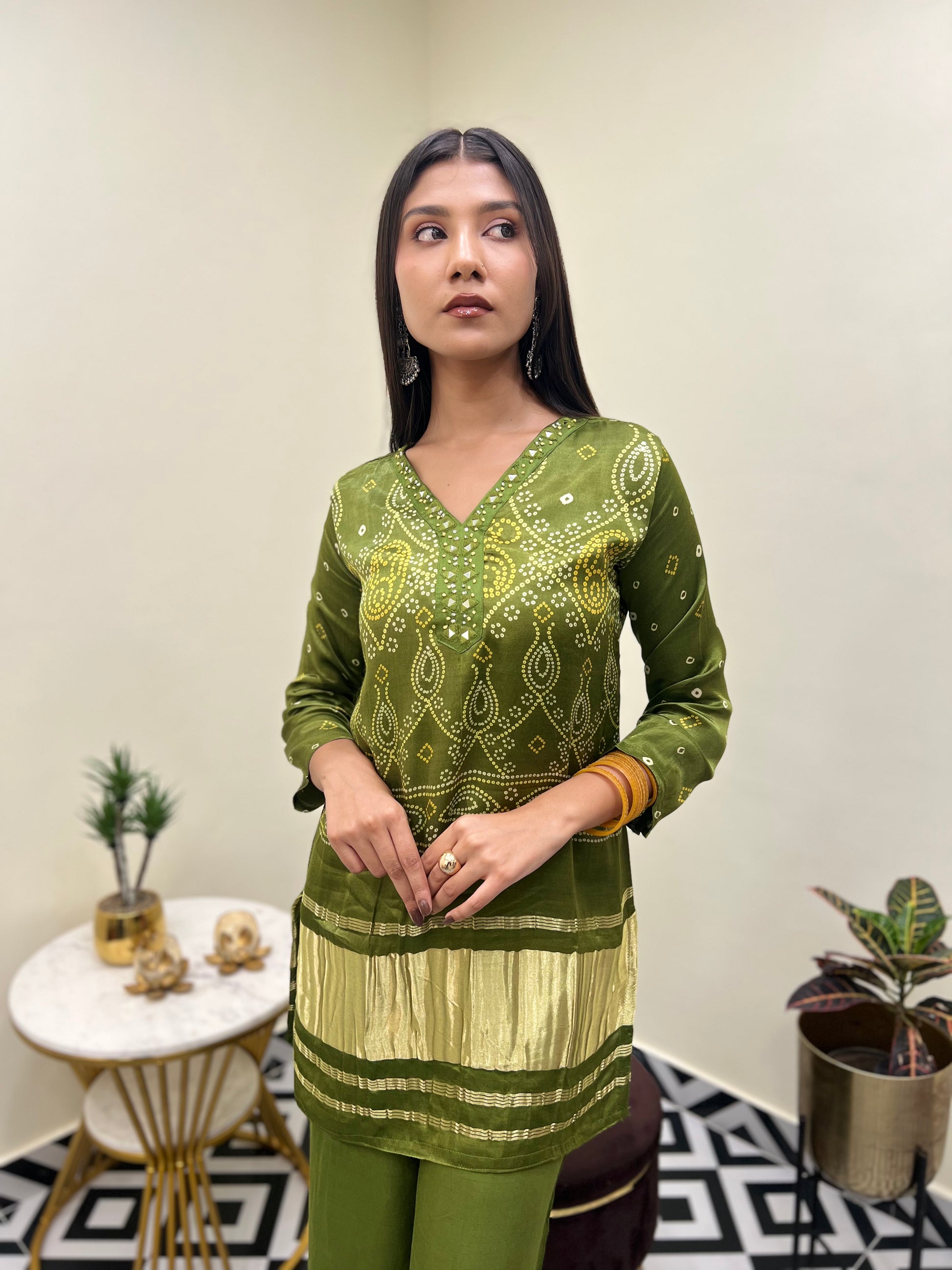 Elevate your festive wardrobe with the Bandhani Luxe Gajji Silk Co-Ord Set, a luxurious ensemble that blends tradition with modern flair. Crafted from premium Gajji silk, this co-ord set features a classic Bandhani print, paired with a flattering V-neck kurta and wide-leg palazzo pants for graceful movement.