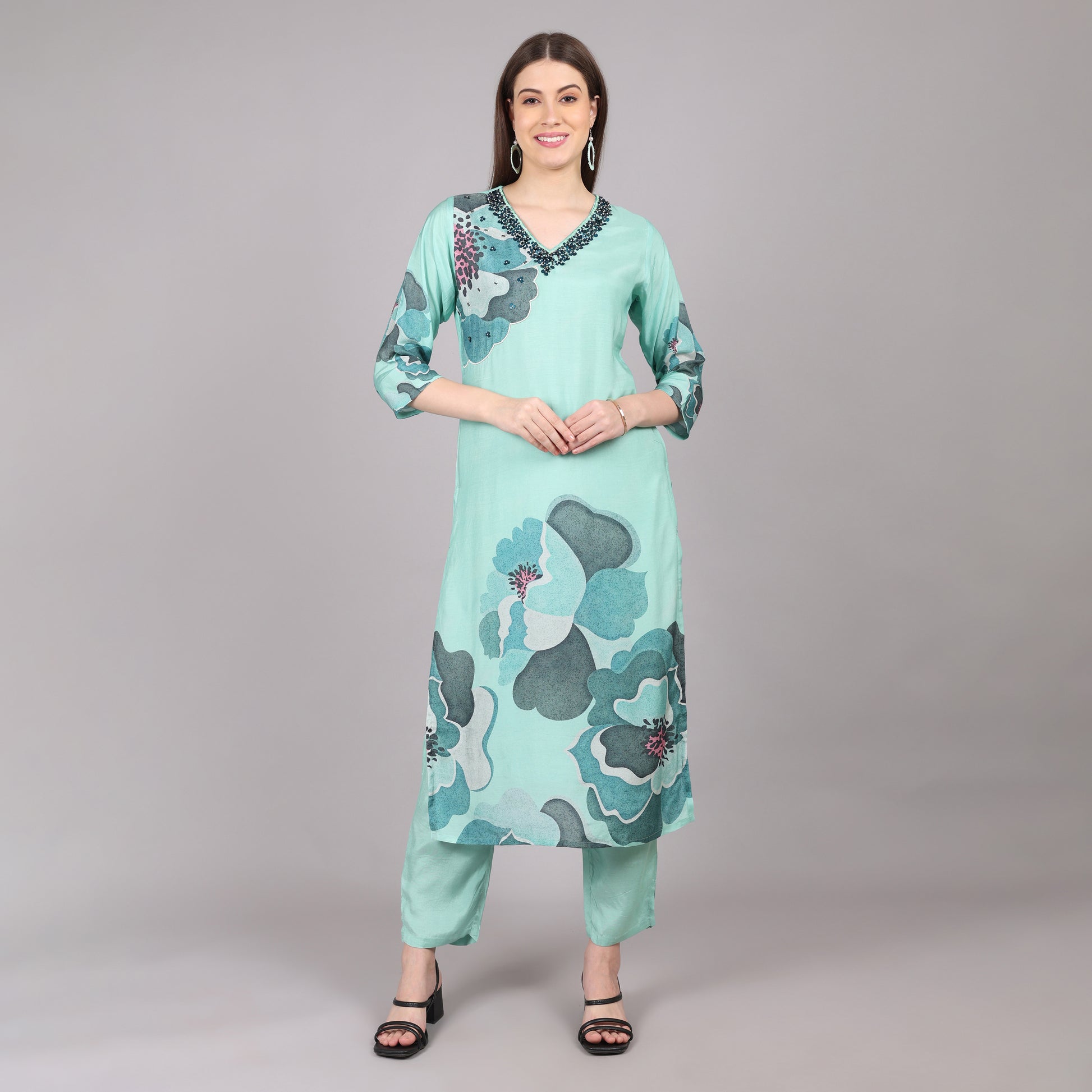 Expertly crafted with crepe material, this kurta set includes a stylish straight pattern with lining for added comfort. The set features a kurta, pants, and dupatta, kurta adorned with intricate handwork on the neckline using polished katdana. Elevate your wardrobe with this stunning digital print kurta set.