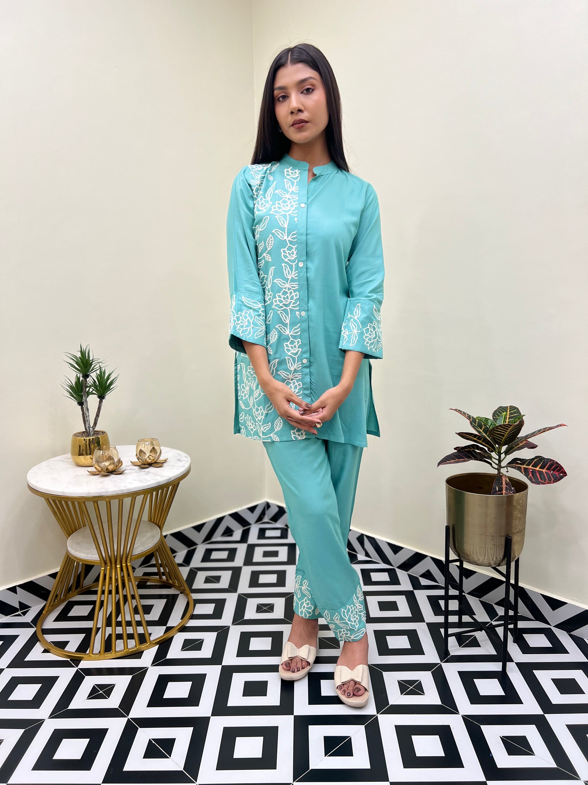 Add a refreshing splash of color to your wardrobe with the Cyan Blue Embroidered Co-ord Set, a seamless blend of comfort and contemporary ethnic charm. Crafted from soft, breathable cotton fabric, this co-ord set keeps you stylish and at ease all day long.