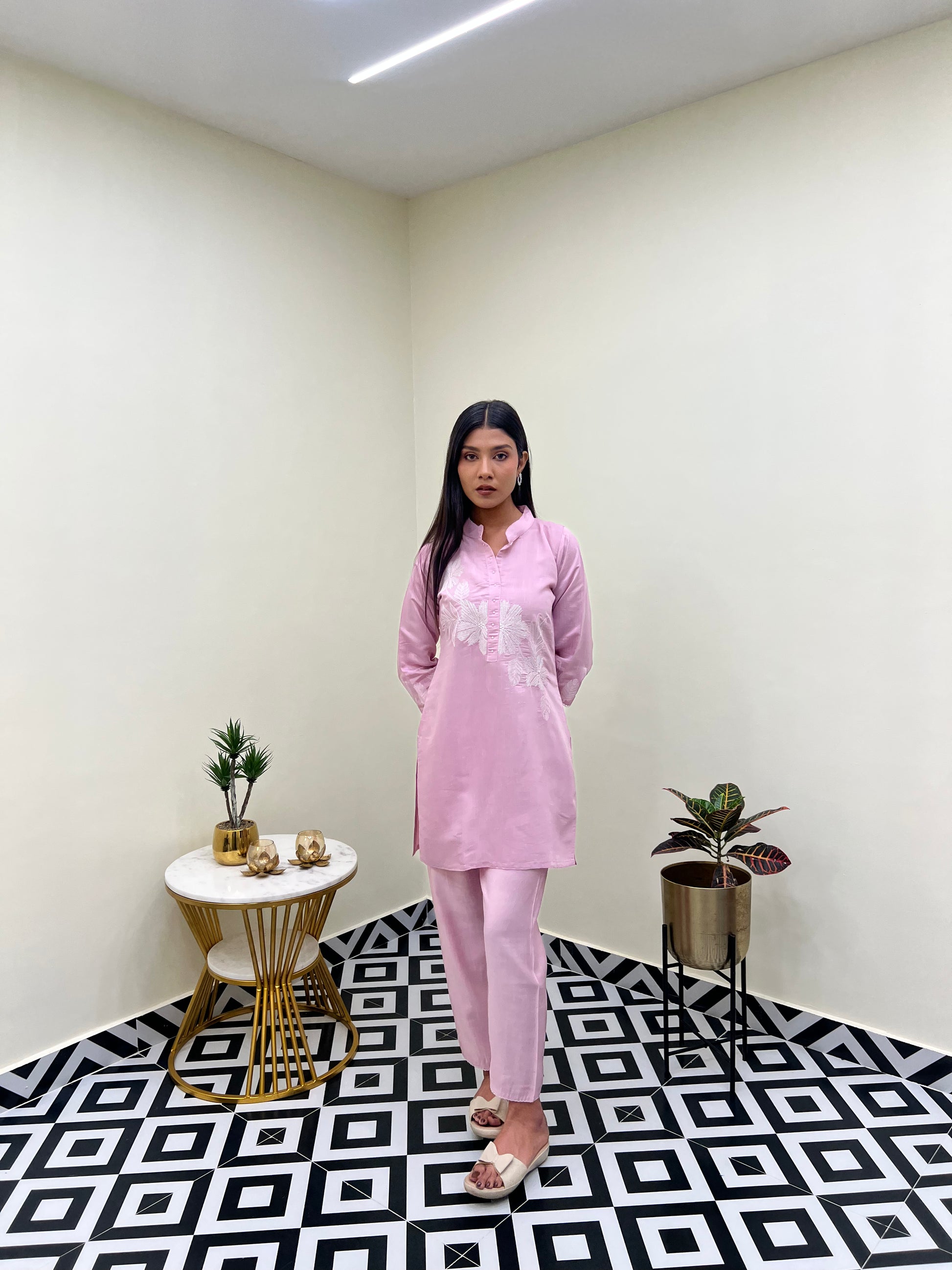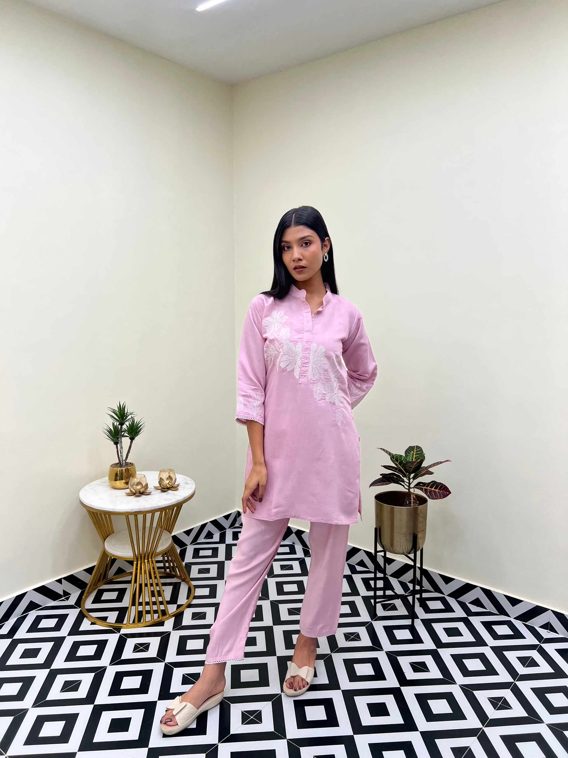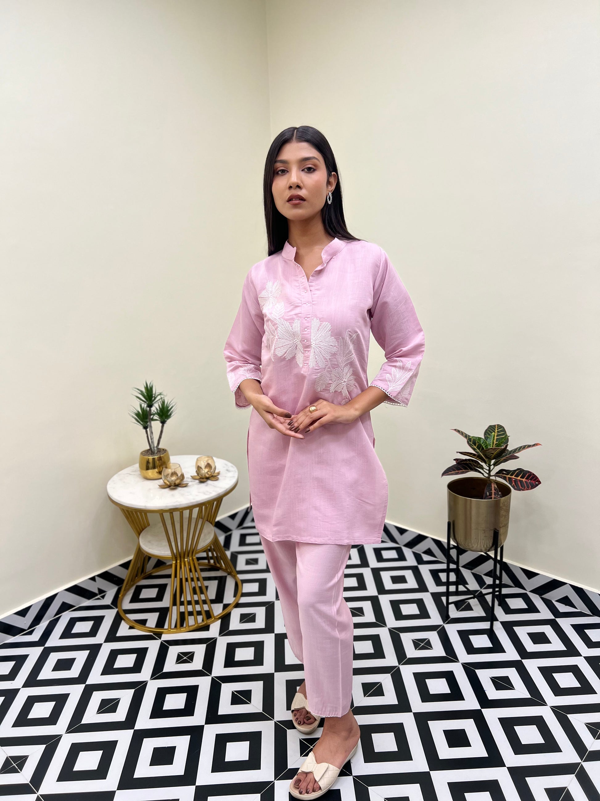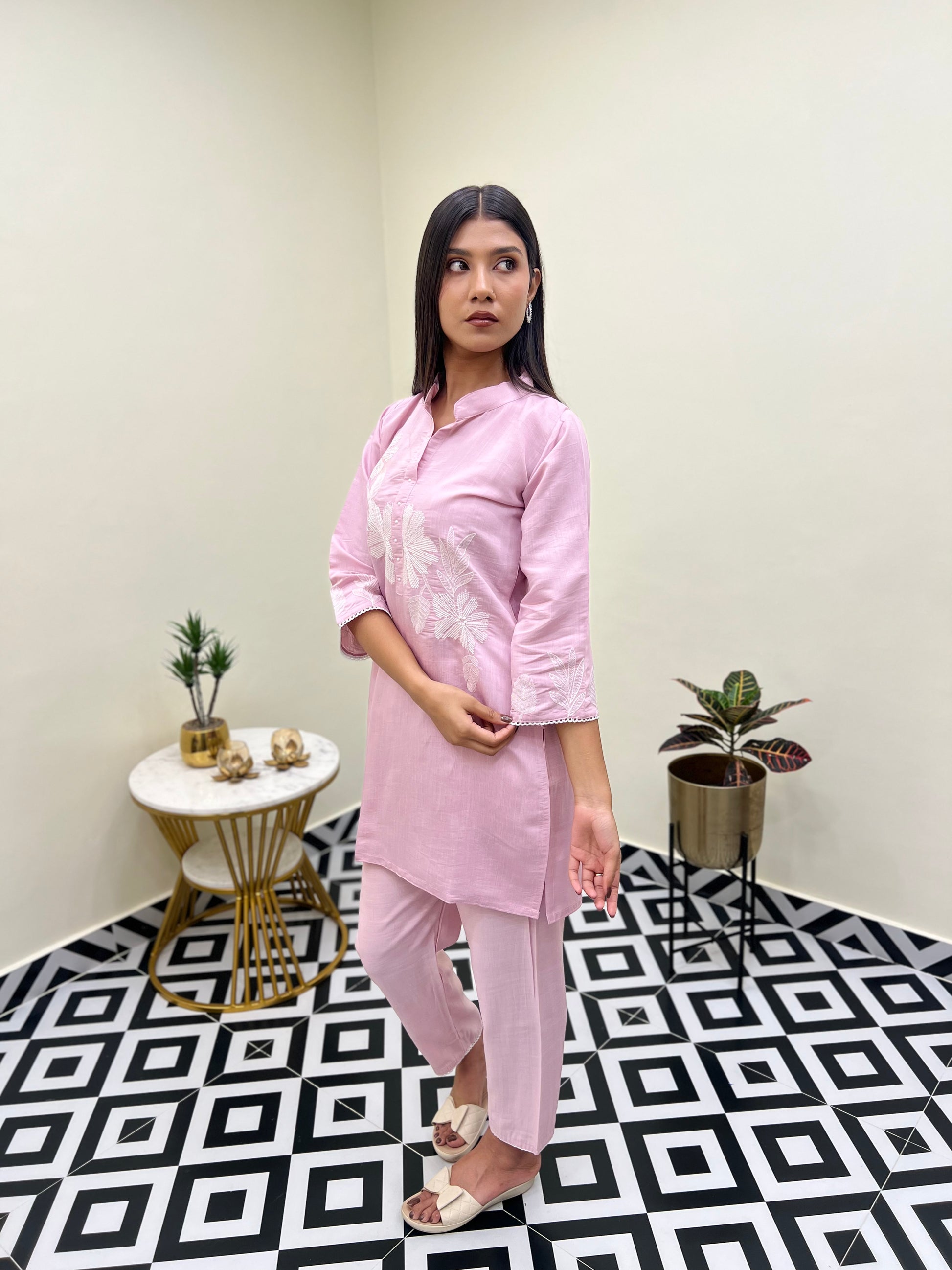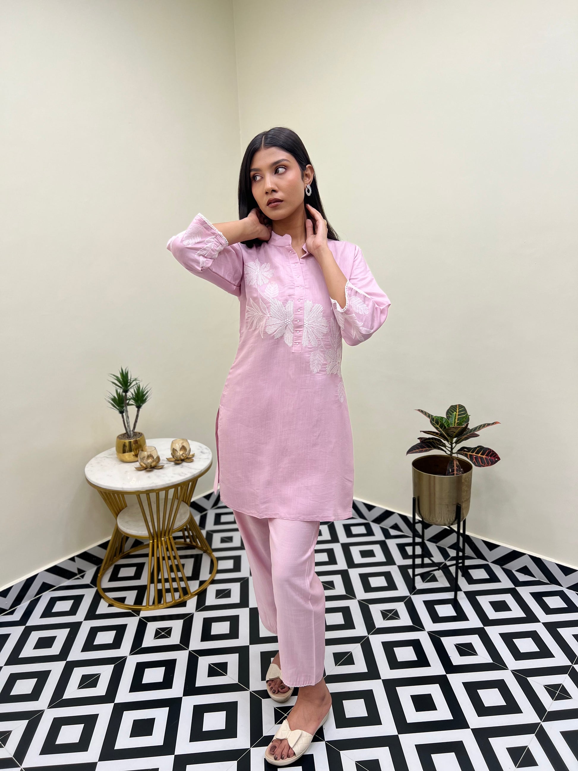 The top features delicate embroidery work on the front, adding just the right touch of detail without overpowering the look. Paired with matching pants, this co-ord set blends simplicity and elegance, making it perfect for work, brunch, or casual outings.
