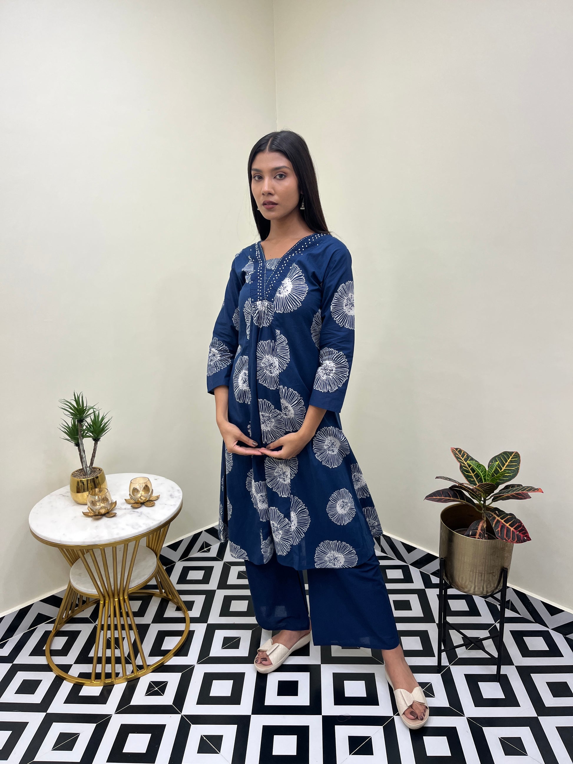 The kurta features a graceful A-line silhouette that flatters every figure, and is paired with a matching palazzo for effortless style. The highlight of this set is the delicate bead work on the neckline, adding subtle sparkle and charm to this minimal yet refined ensemble. Perfect for everyday wear or casual festive gatherings.