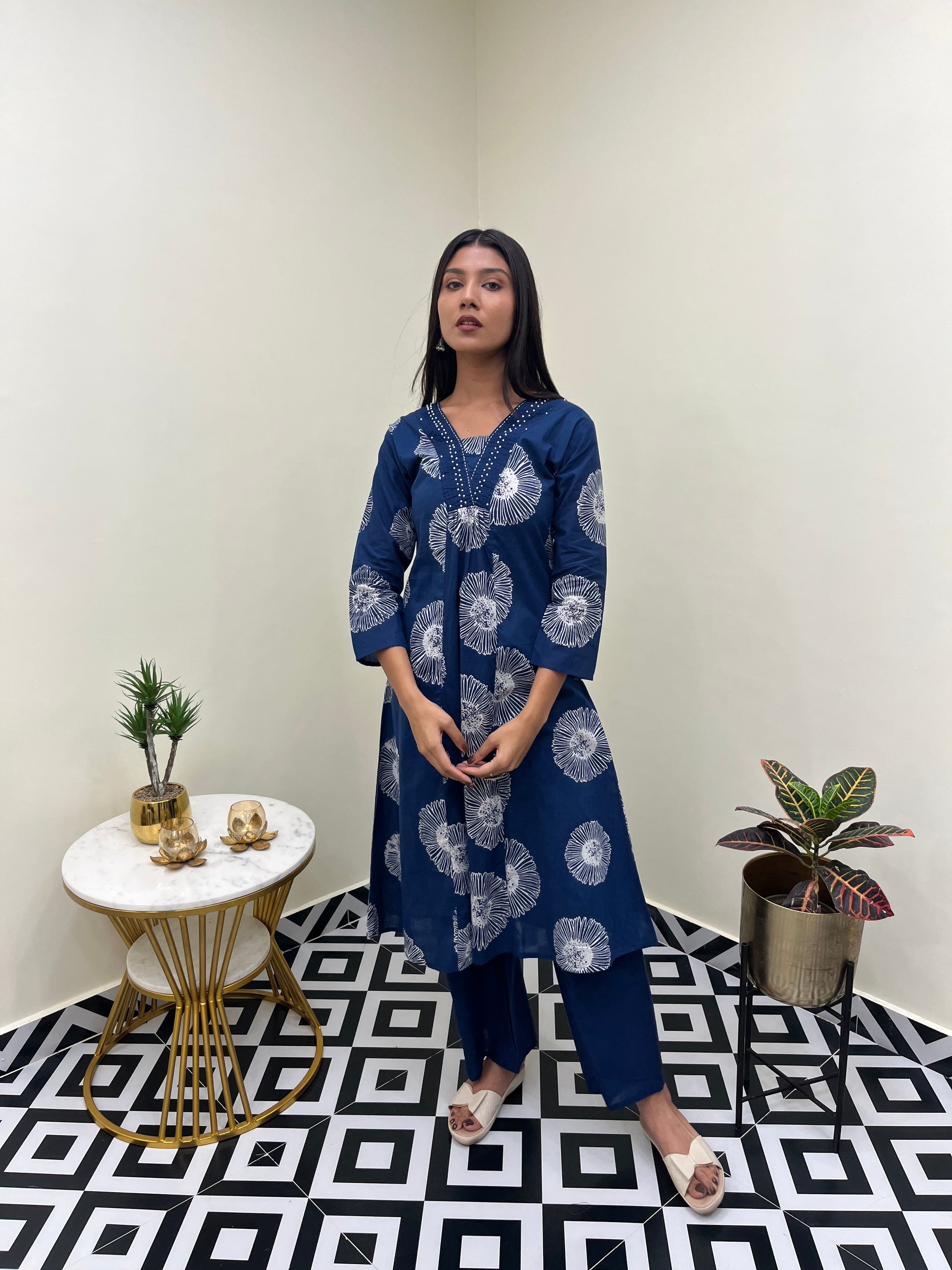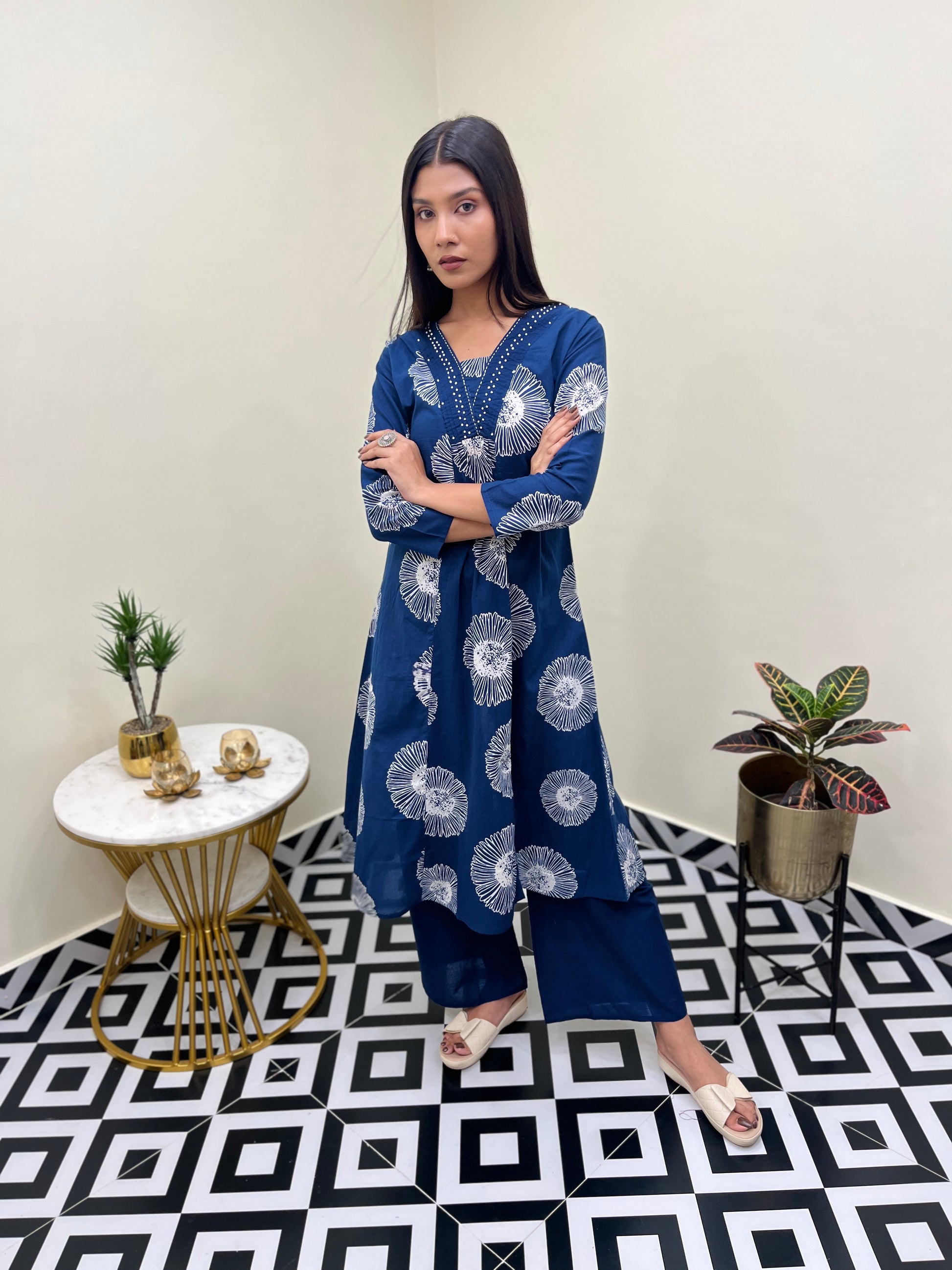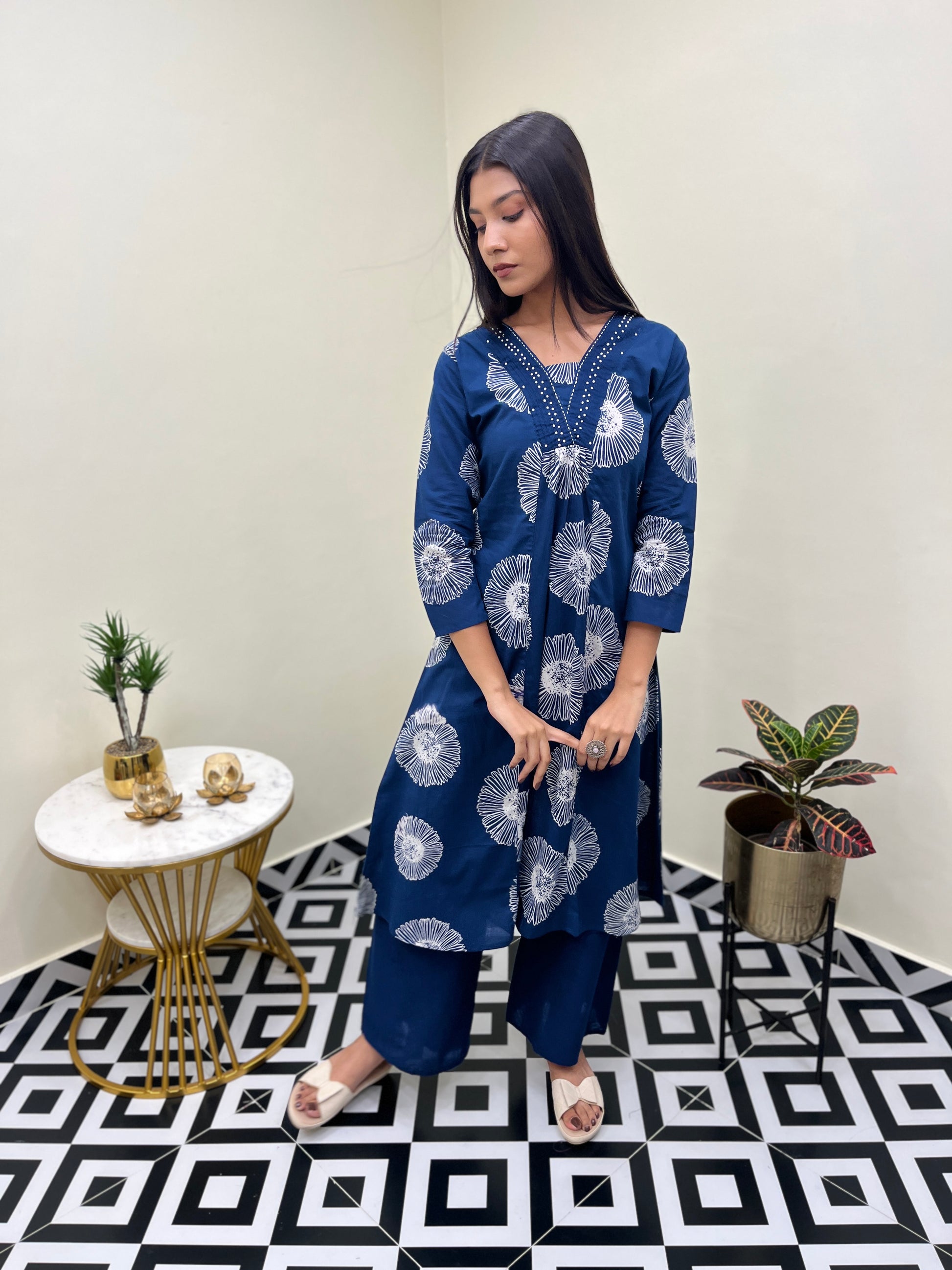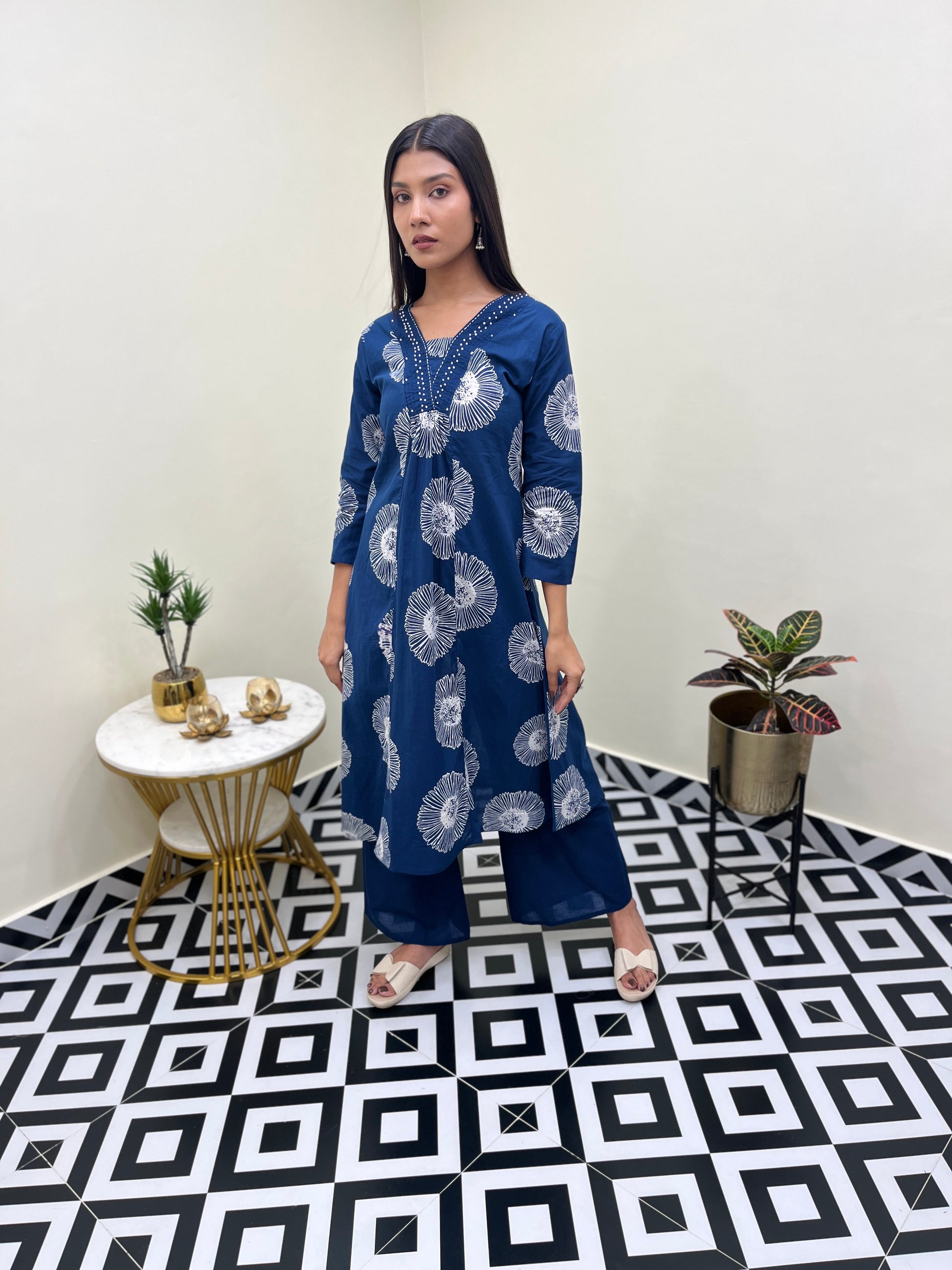 - Design: A-line kurta with matching palazzo pants