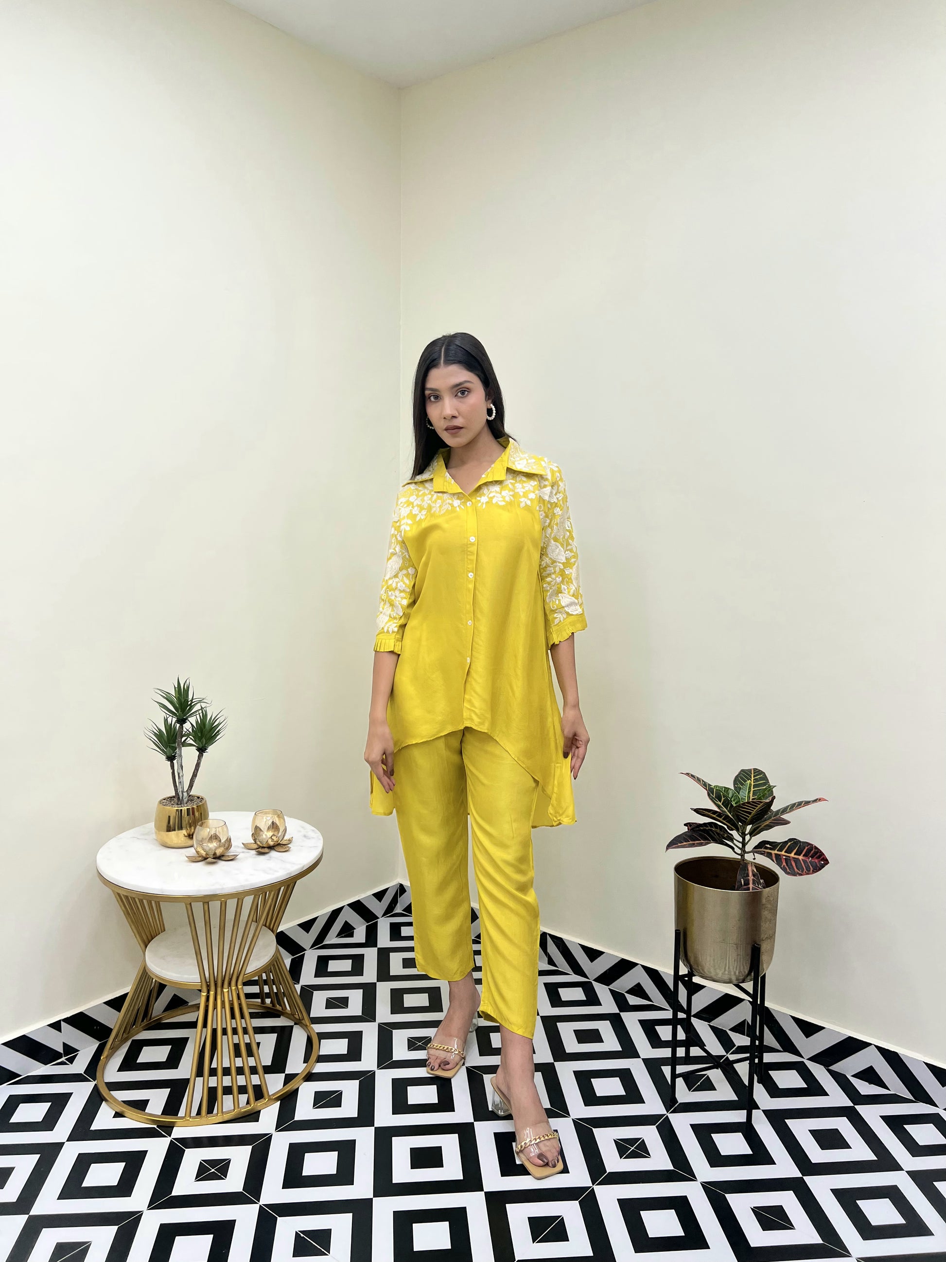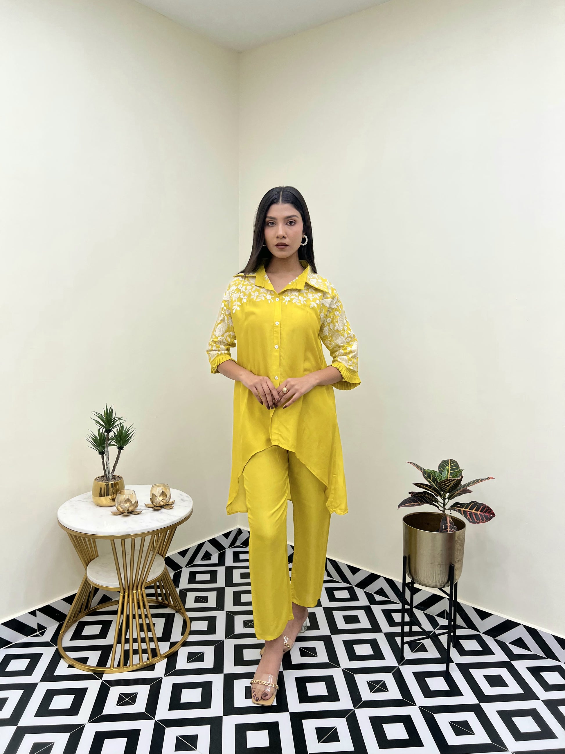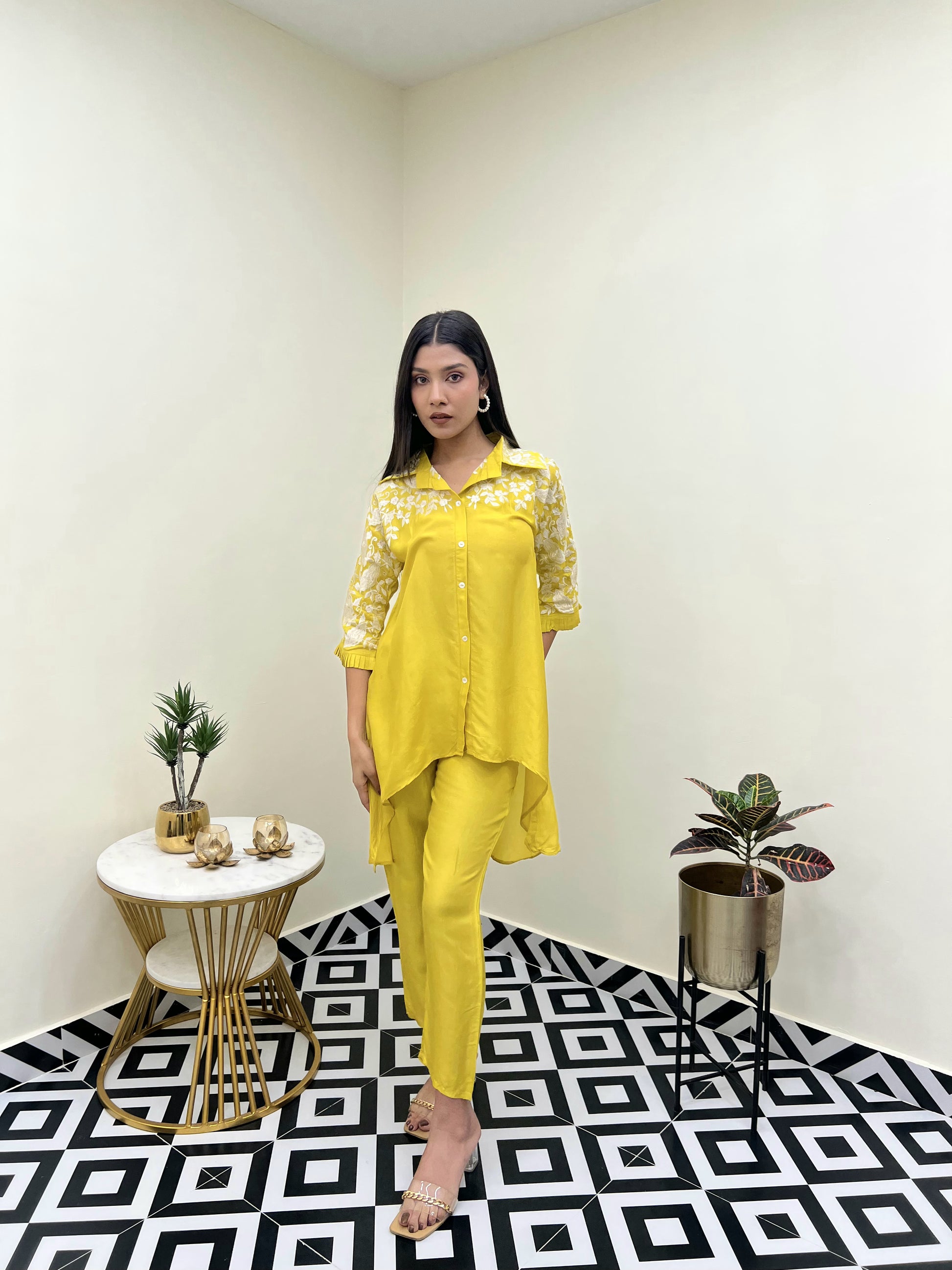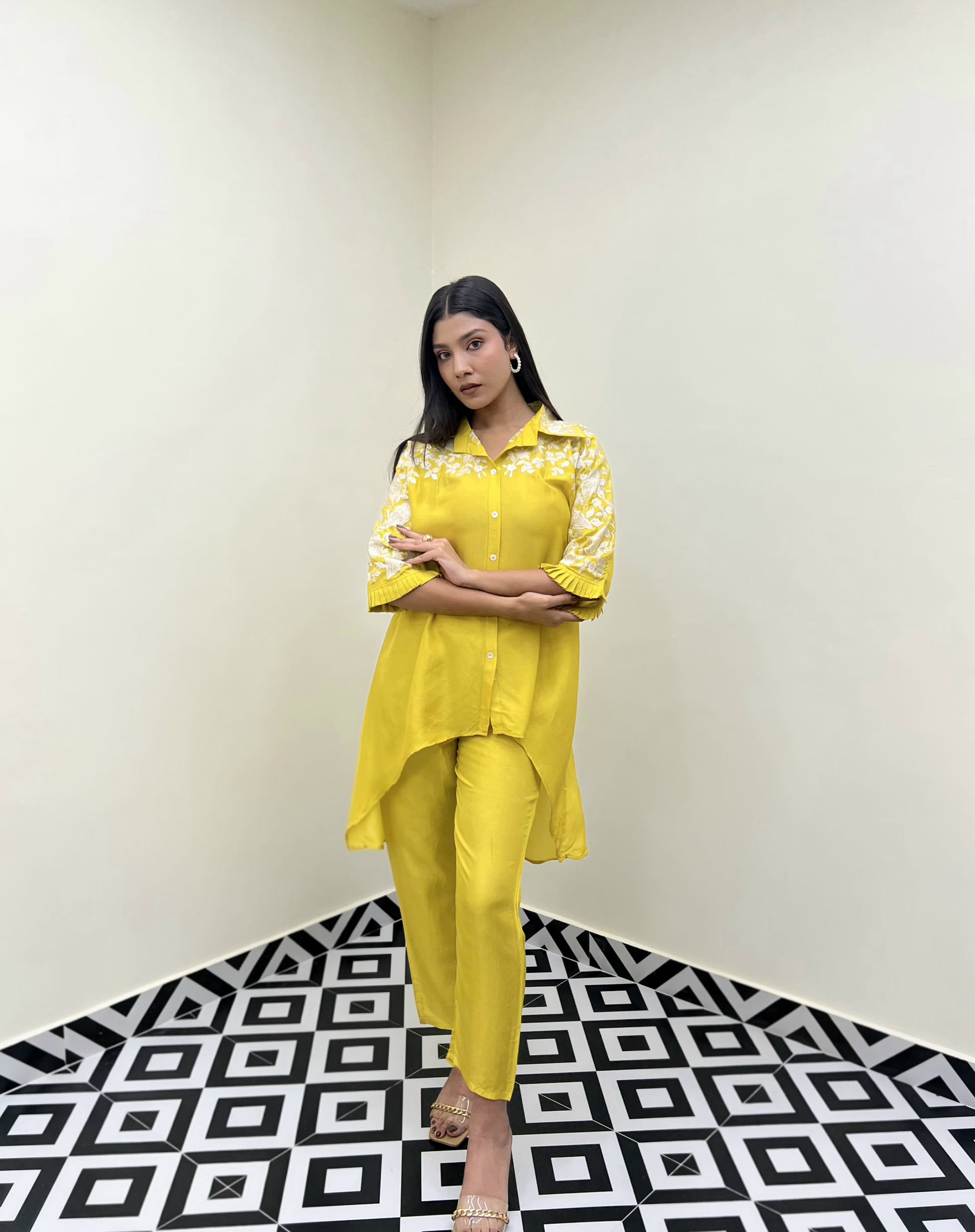 Bright, breezy, and beautifully festive, the Lime Yellow Chinon Silk Co-ord Set is made to brighten up your wardrobe with its easy elegance. Crafted from high-quality Chinon silk, this set drapes gracefully while keeping you light and comfortable throughout the day.