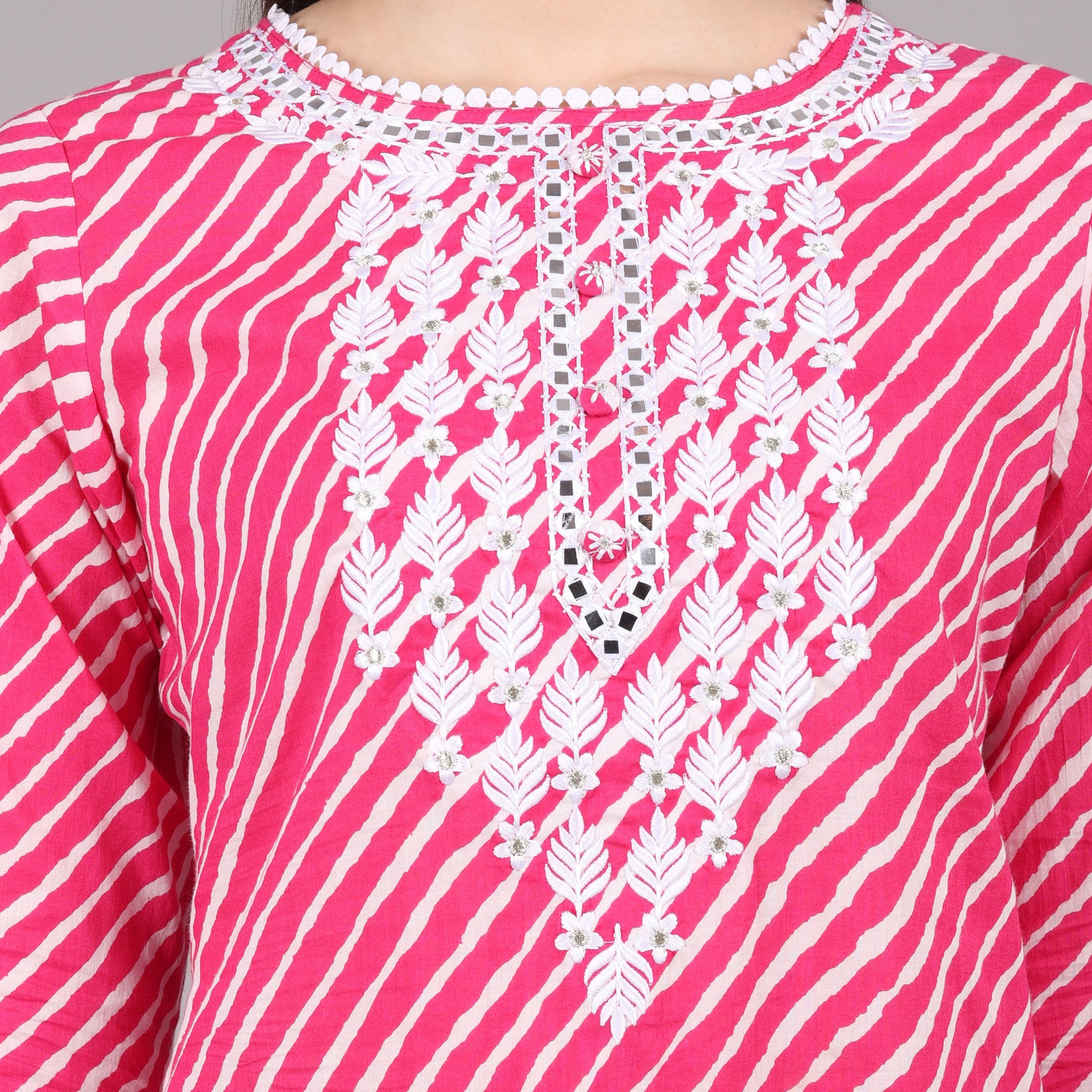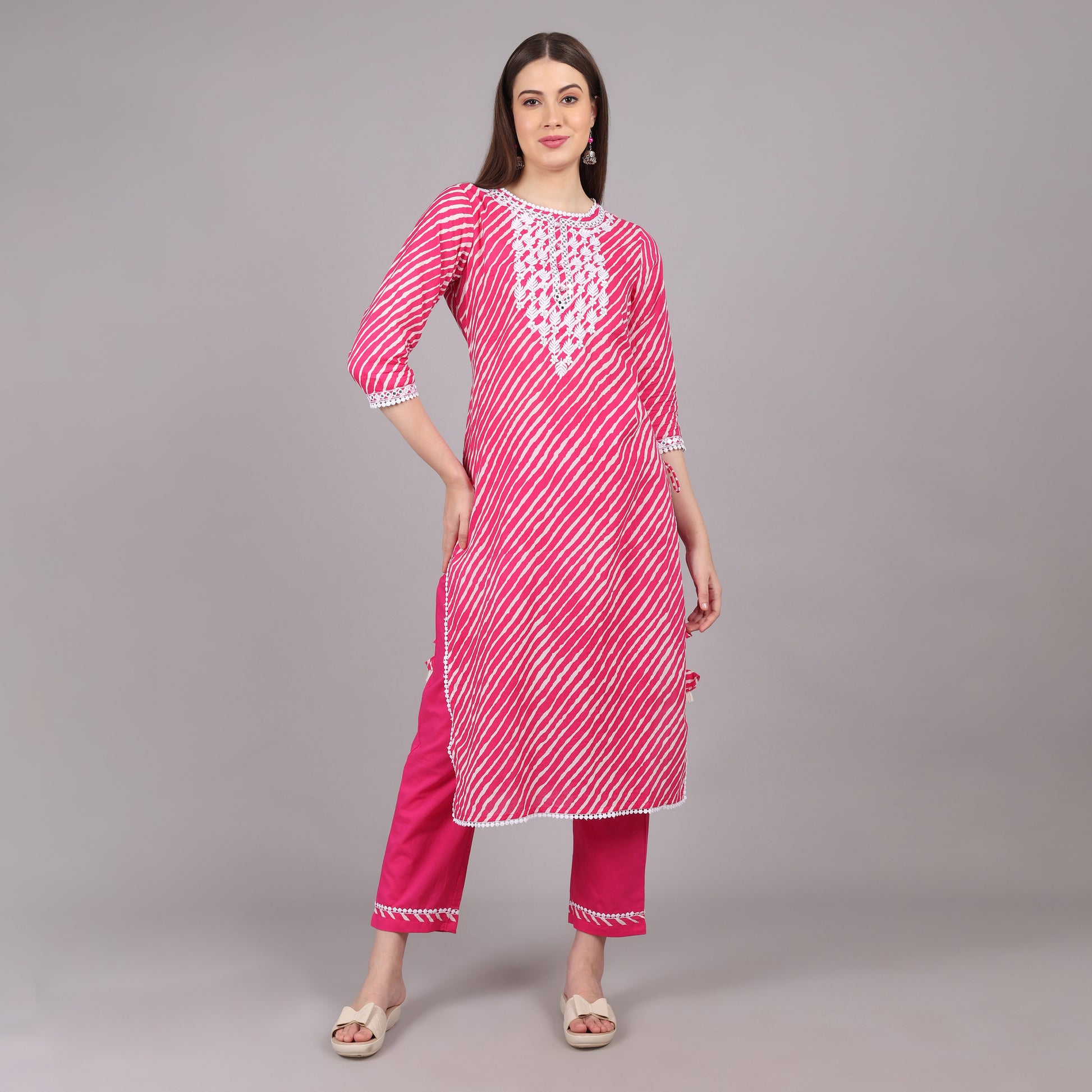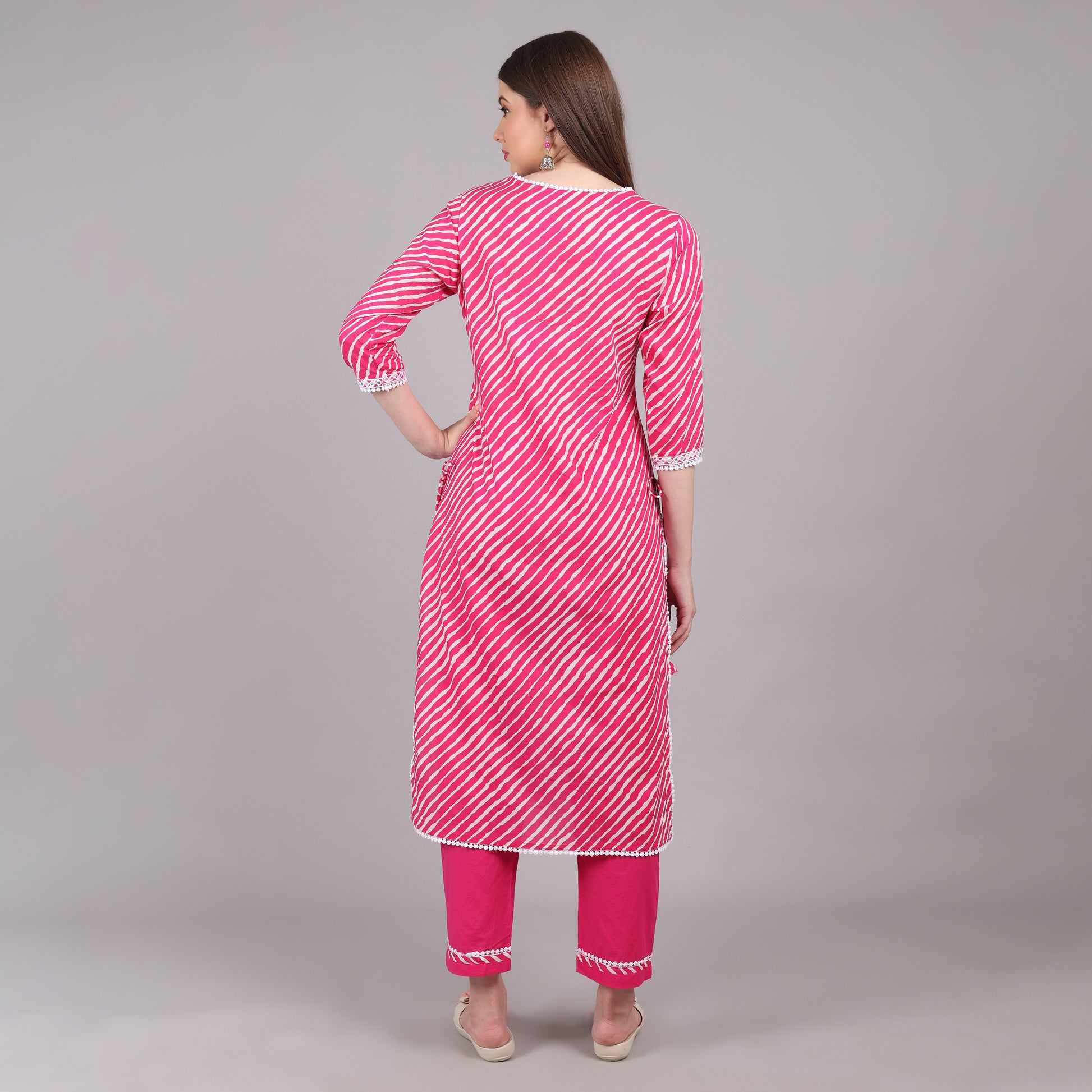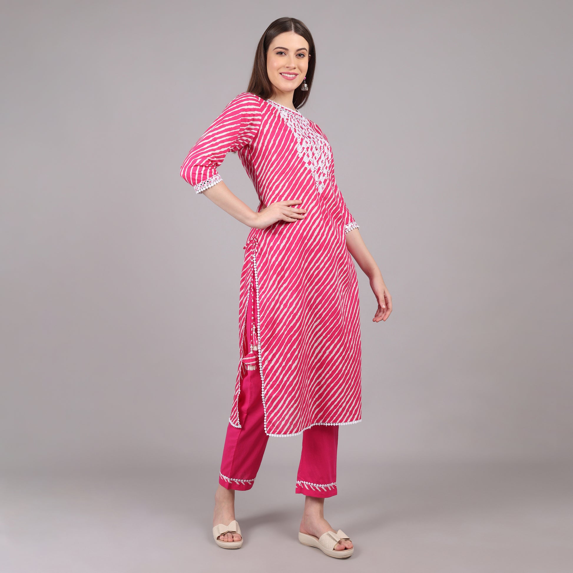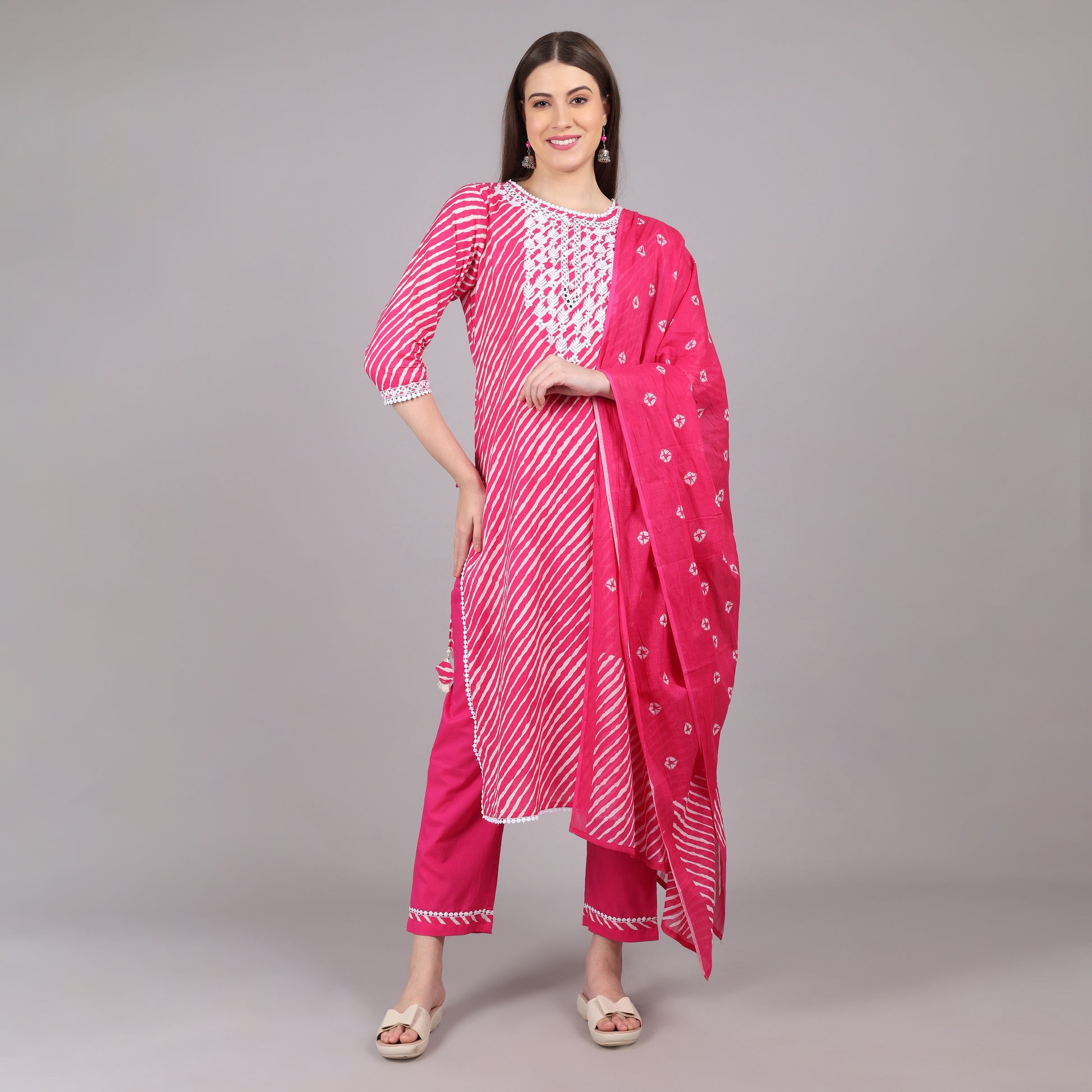 The Pink Leheriya Kurta Set includes a kurta, pants, and dupatta, all made of high-quality cotton fabric. The traditional Jaipuri Leheriya pattern adds a touch of elegance to the straight-cut design. The kurta, pants, and dupatta are all crafted without lining, making them lightweight and comfortable to wear.