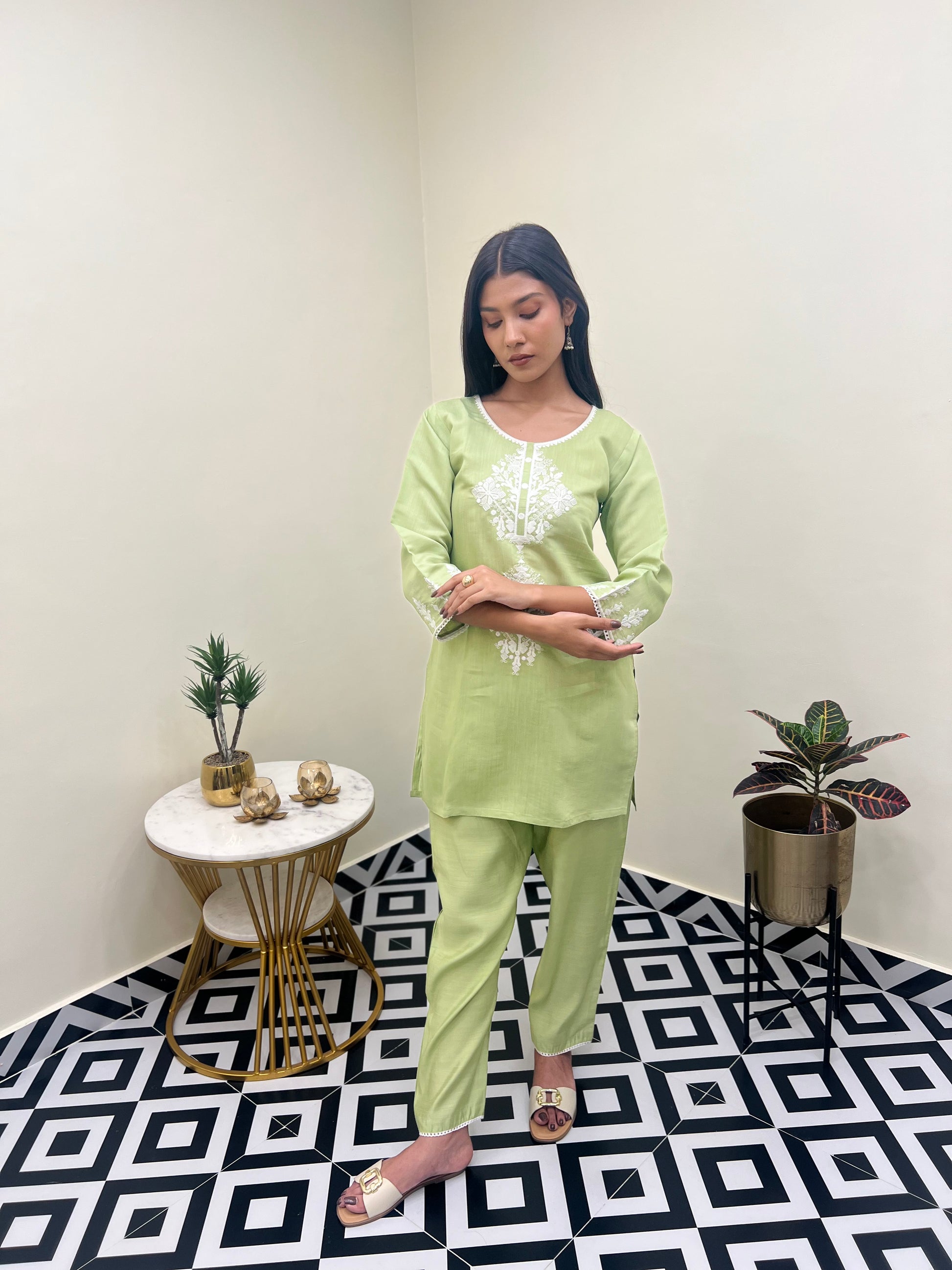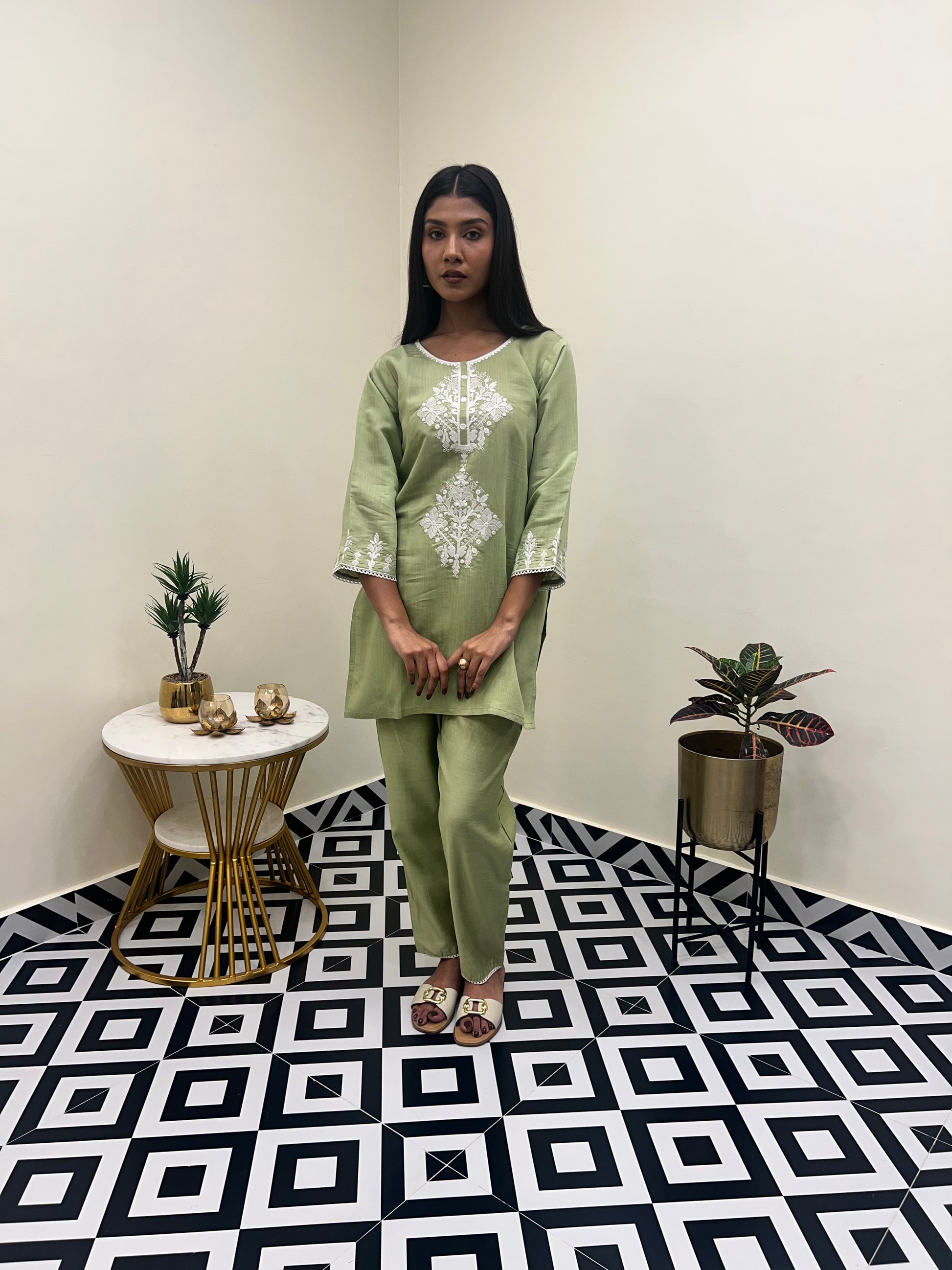 Fresh, feminine, and effortlessly chic – the Pista Green Embroidered Co-Ord Set is designed for comfort with a touch of elegance. Made from soft, breathable cotton fabric, this set includes a relaxed-fit top and pants, making it perfect for everyday style or casual get-togethers.